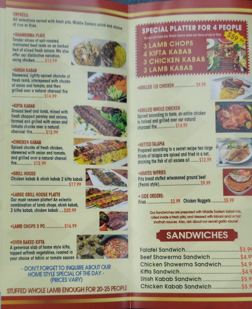 Start your meal with tantalizing appetizers like the savory Meat Pie or the homemade Stuffed Eggplant. The extensive sandwich selection includes the beloved Chicken Kebab and the flavorful Falafel Sandwich, each wrapped in warm pita and drizzled with tahini.